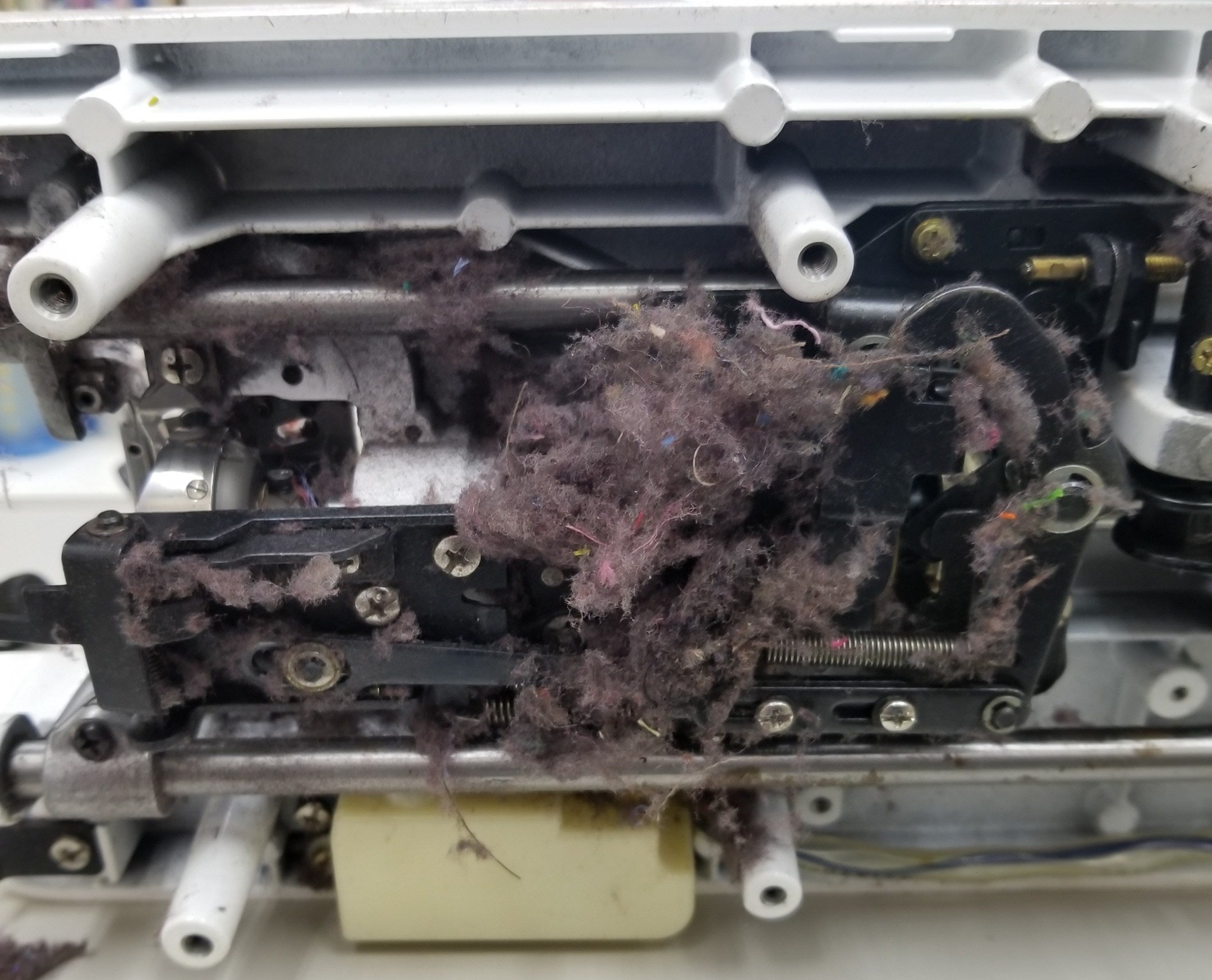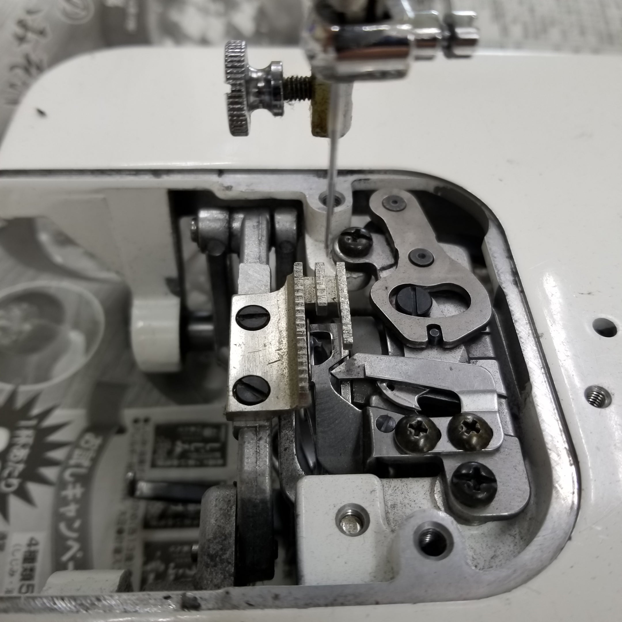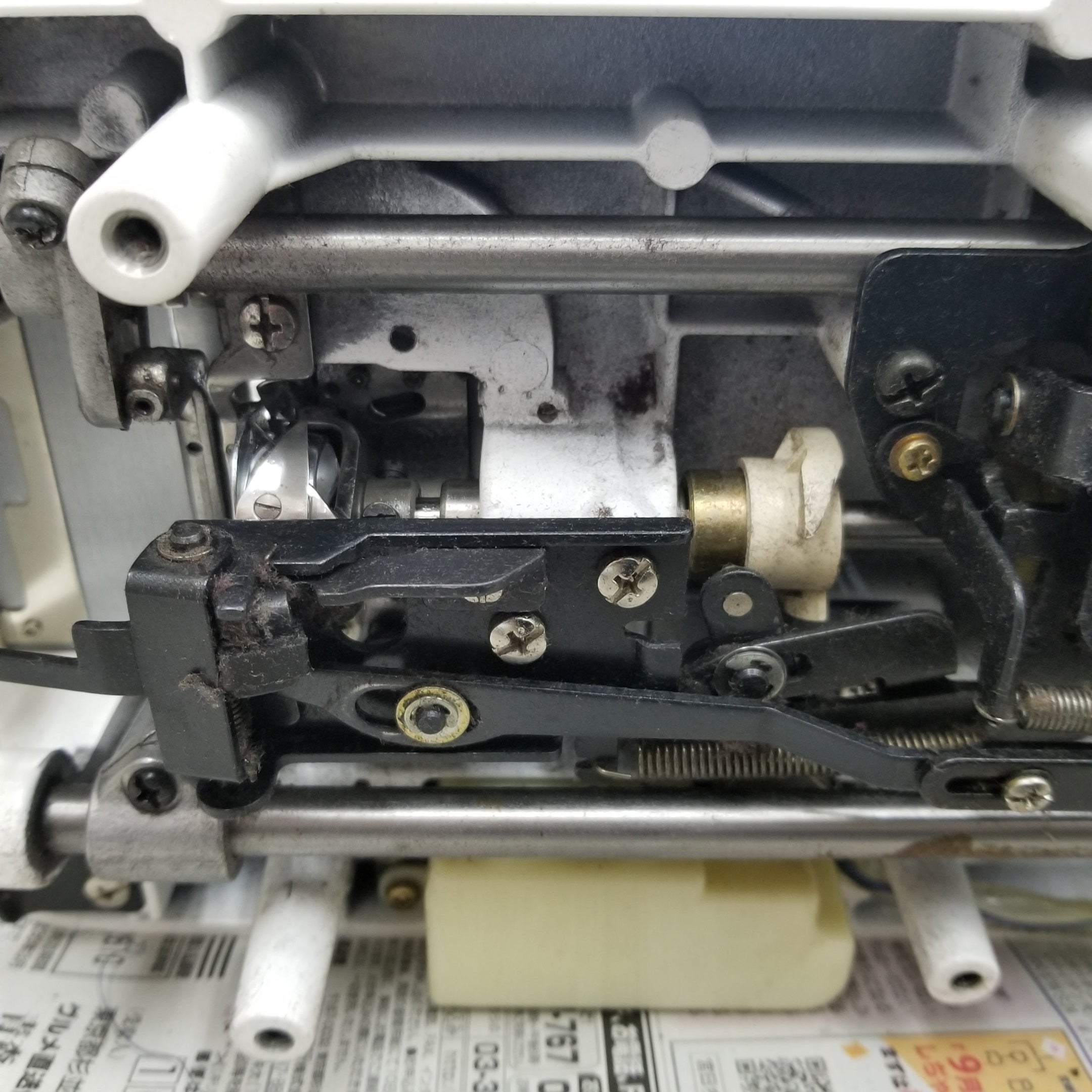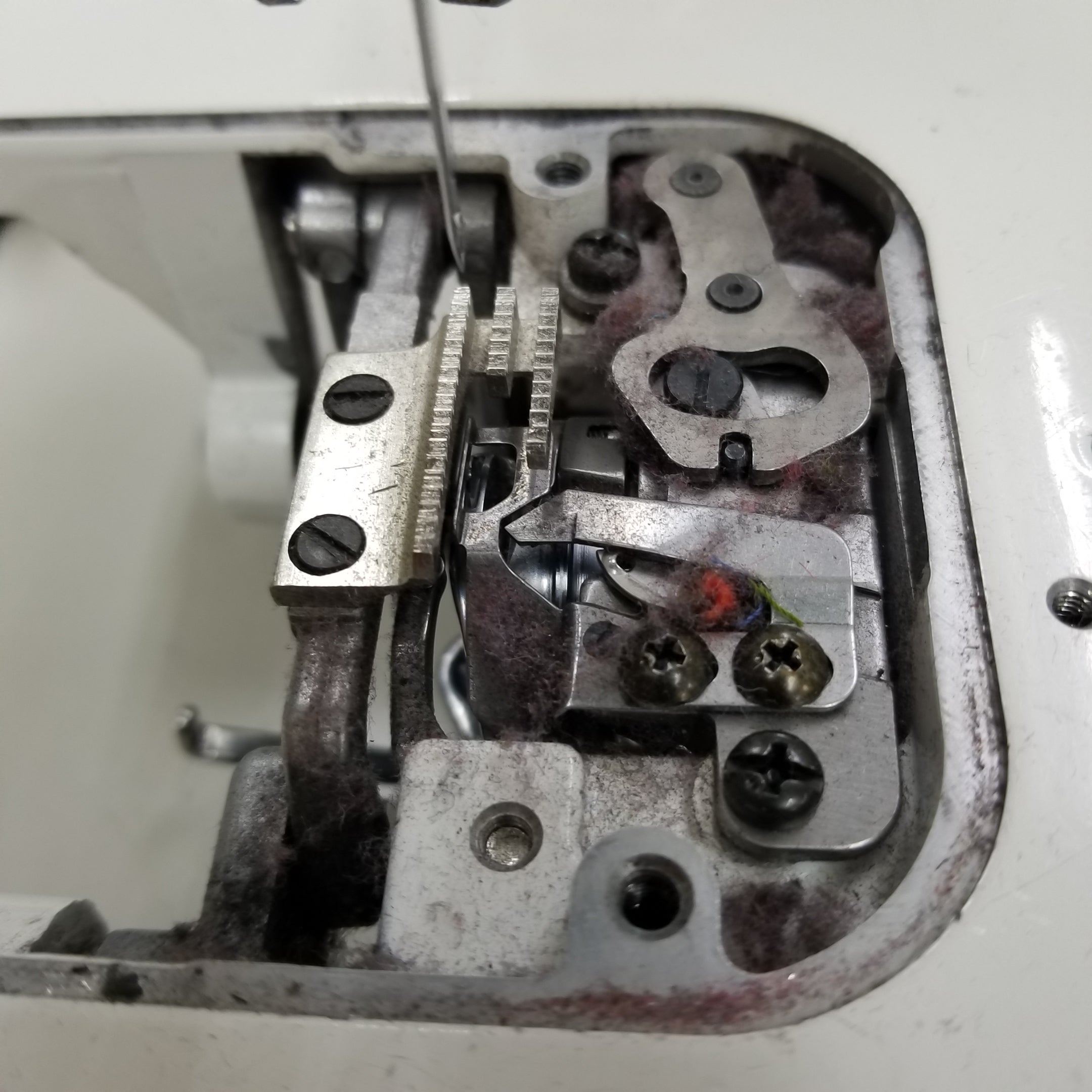 針板を外すと釜、送り歯、糸切メスにホコリや糸くずが