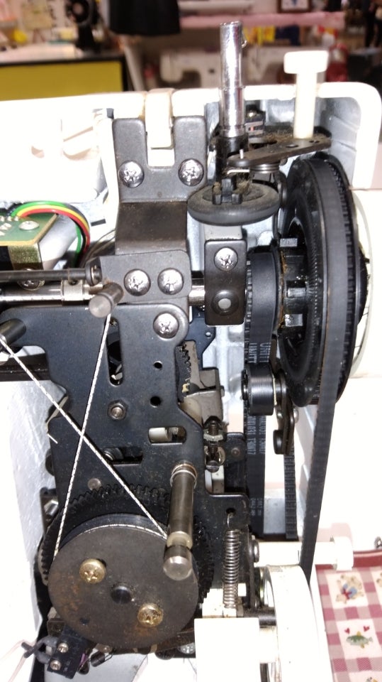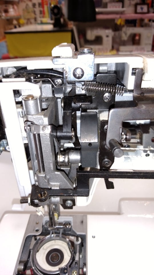 症状は、縫い目の調子はいいけど動きが重くプーリー(右側面の針棒を回す所)が固いという事です。お孫さんの入園入学の準備で使用するので直してほしいとの事でした。