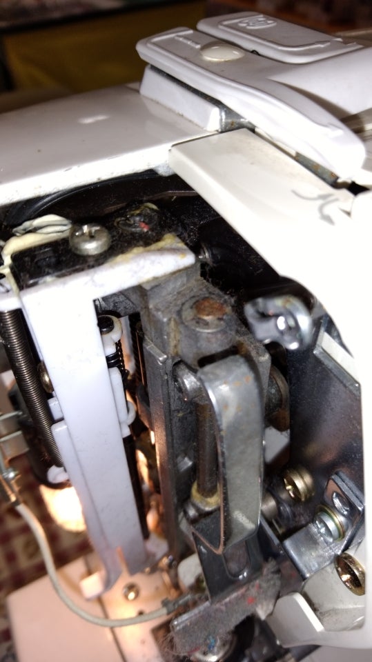 まずは、ミシンの横カバー(針棒のところ)を外して確認。(下の写真)