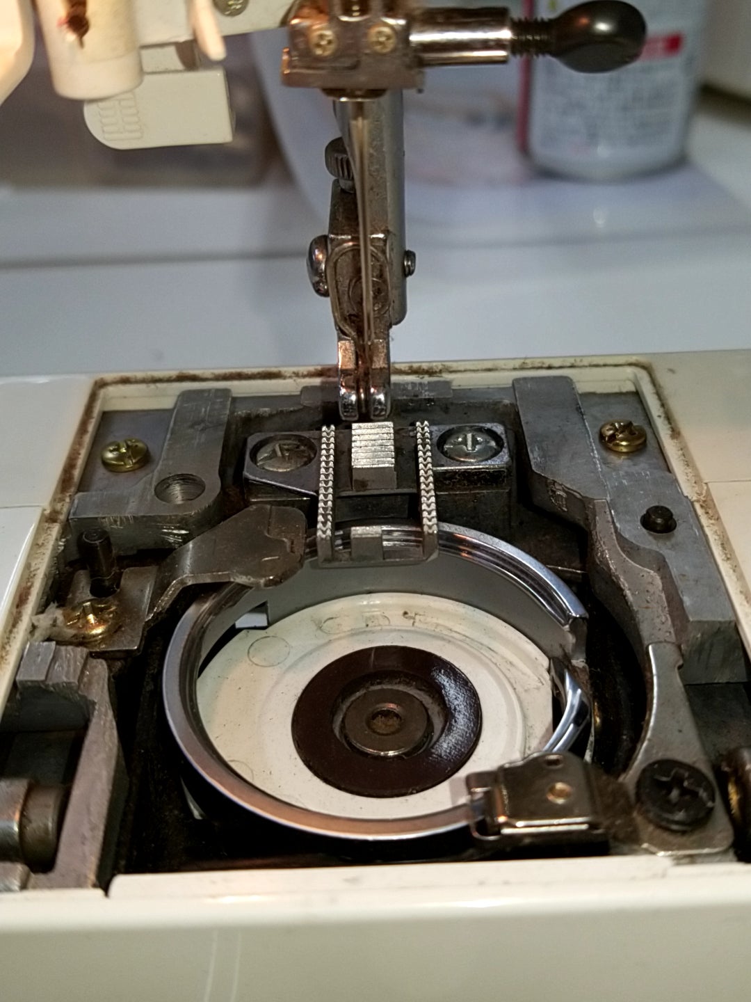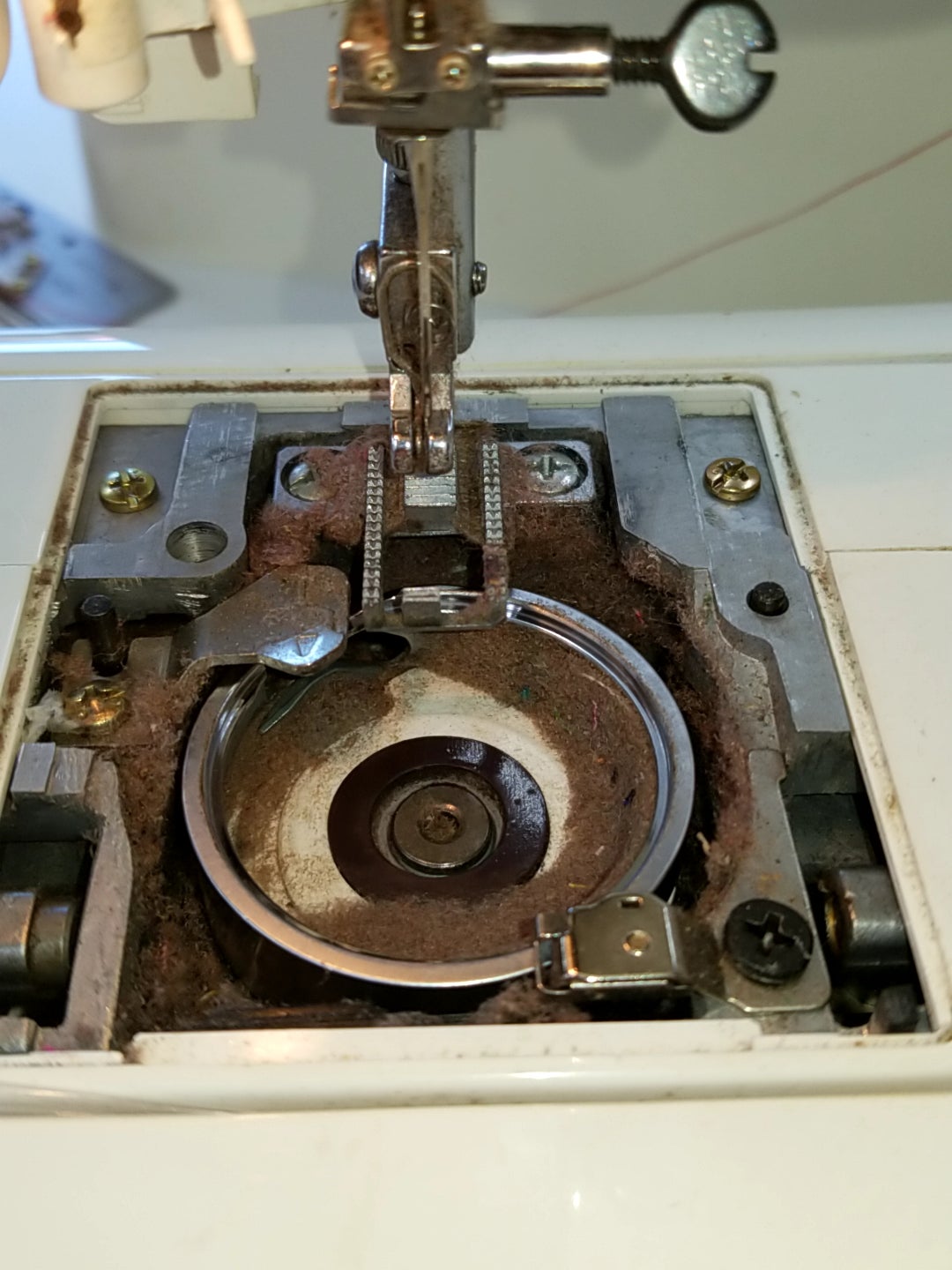 各部の点検をしていくと以前使った布ホコリや糸くずなどが送り歯や釜などに