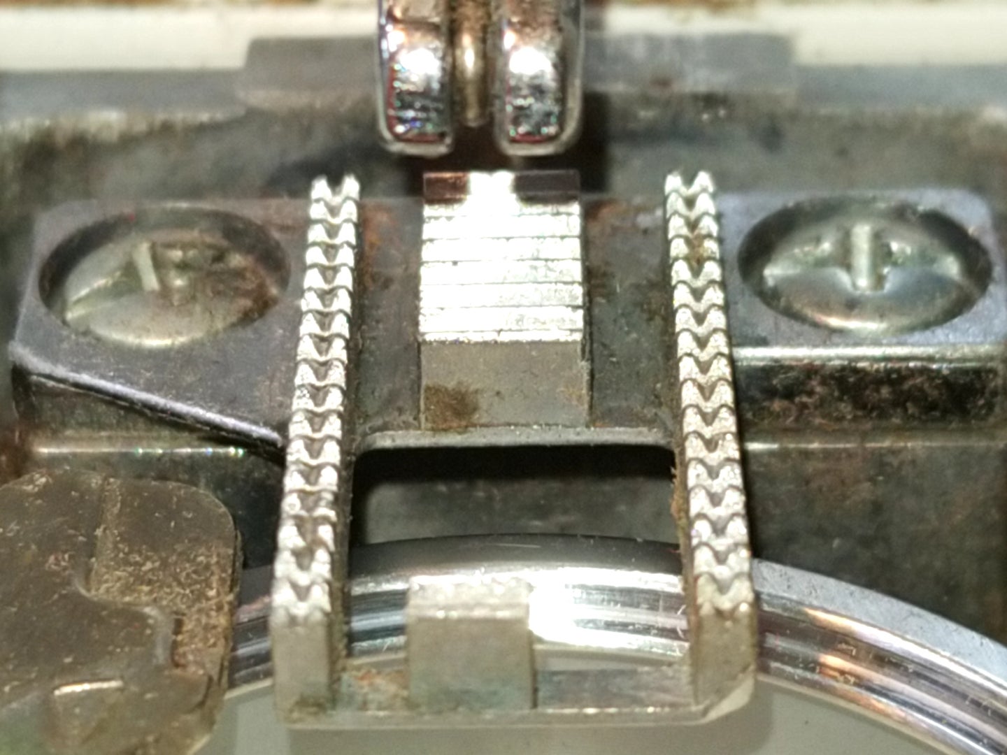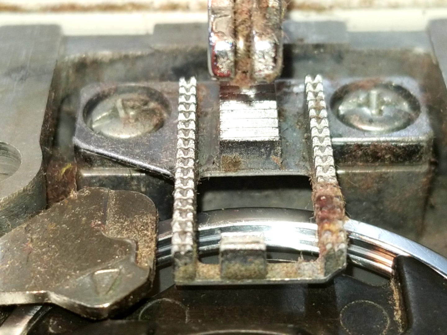 送り歯に左側にサビとホコリが詰まっています。
