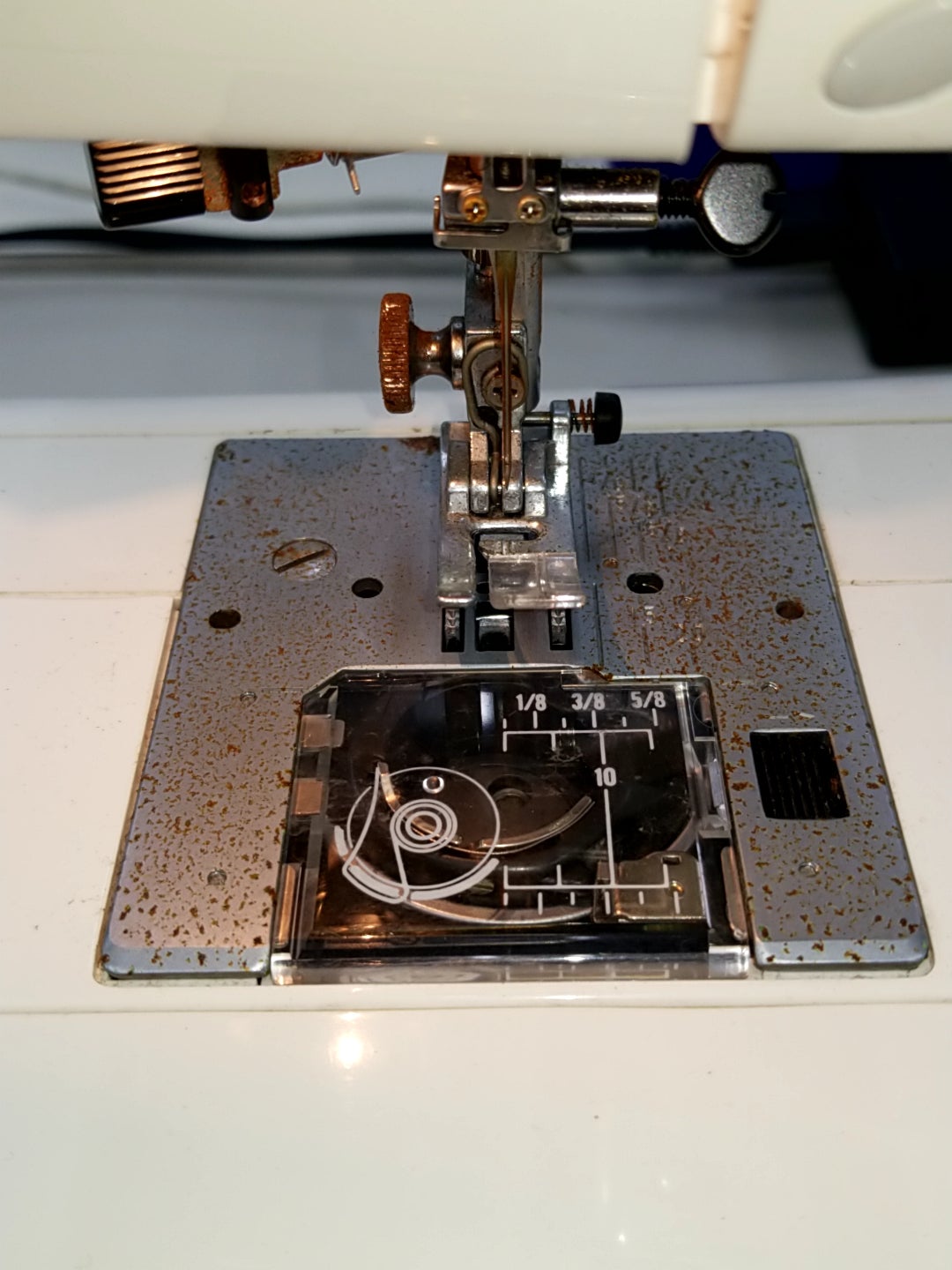 針板や押さえ棒、天秤、下糸巻など金属で作られている部分にサビがでています。