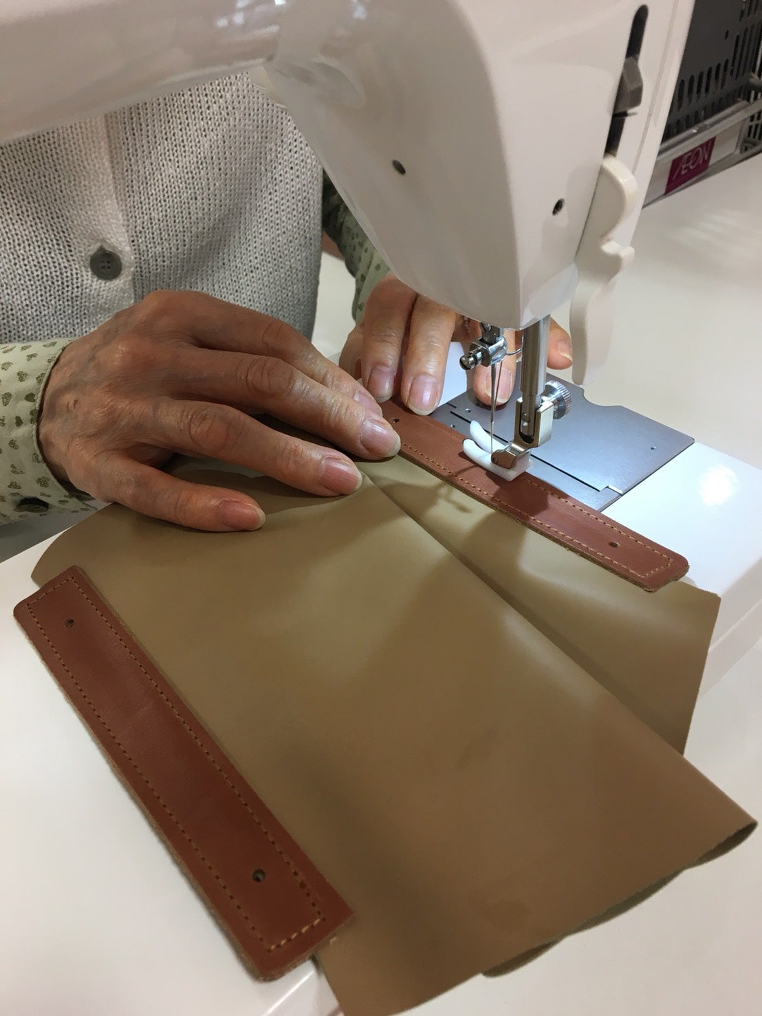 今日はJUKIの職業用直線本縫いミシンを使って革の素材を使った