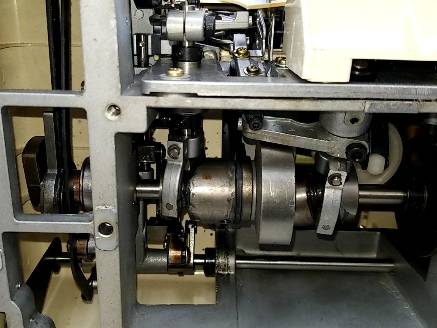 はずみ車駆動軸、下ルーパー駆動軸カムなどのクリーニングと注油をします。