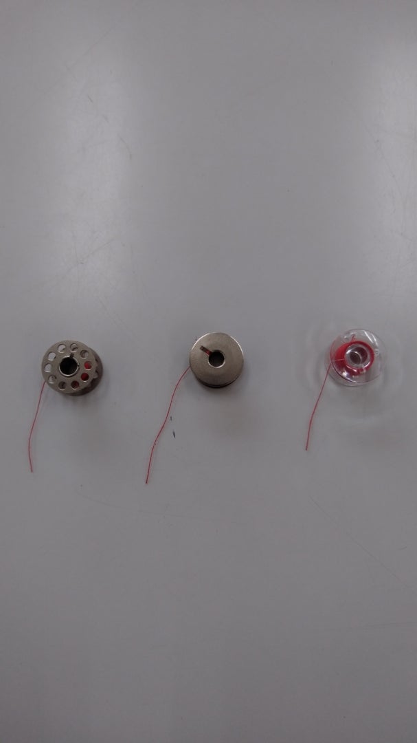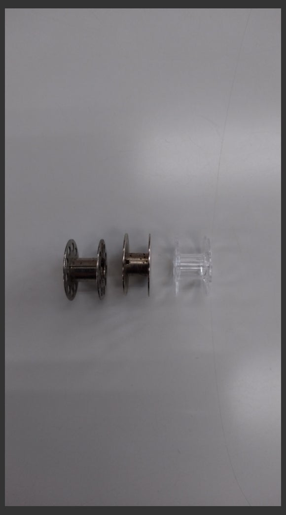 ボビンは、左側から半回転釜用ボビン,全回転釜用ボビン,水平釜用ボビン(下の写真)