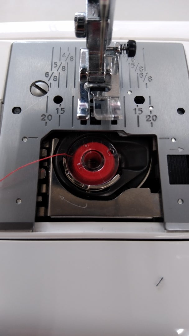 ボビンケースを上からかぶせれば、正解です。あとは、ボビンケースの糸を通す溝に沿って入れれば、完了。(下の写真)