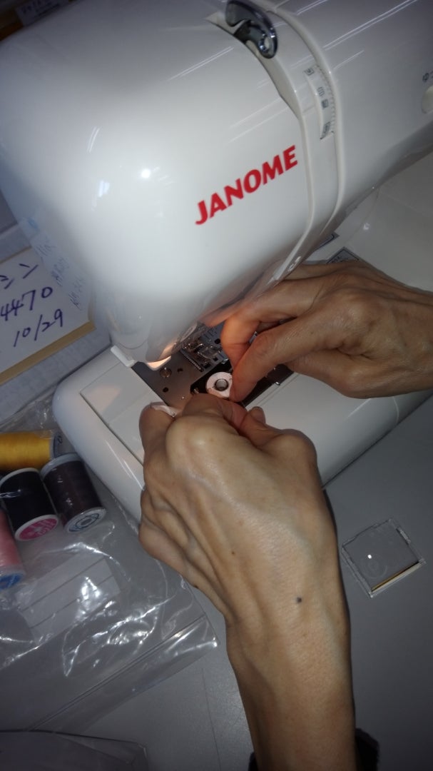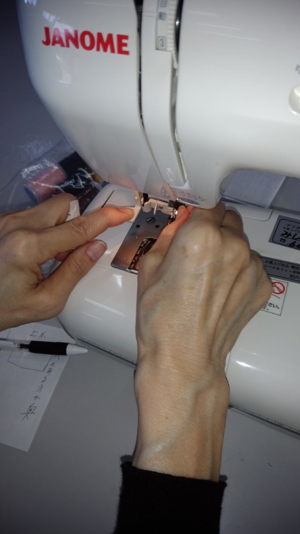 せっかくだからと、もう一度『上糸かけ,下糸の入れ方,自動糸通しも教えてほしい』という事で、そちらもまず私がやって見せて、そのあとお客様にして頂きました。