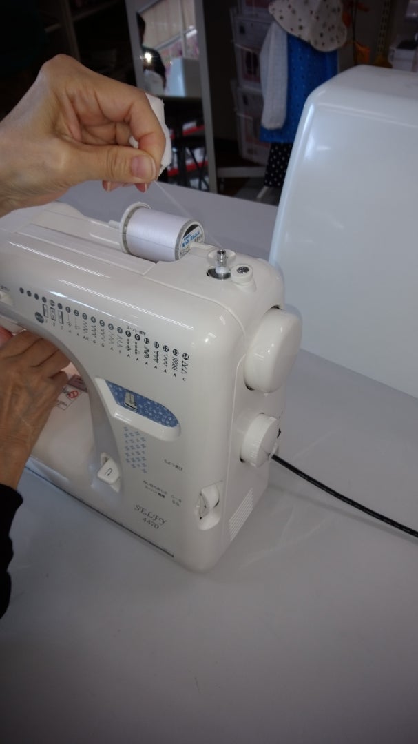 本日は、お客様にミシンの使い方を指導しております。ミシンは、ジャノメさんの『セルフィ4470』という機種です。