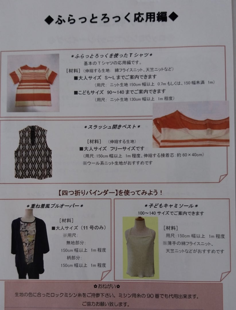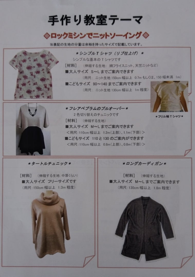 また、ロックミシンだけ使用しての手作り教室のテーマは、以下の通りです。
