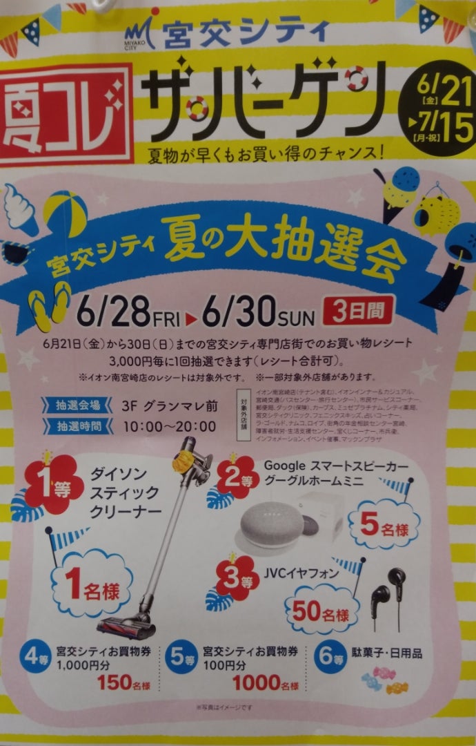 期間は、6月21(金)~7月15日(月)までです。おねがいまた、21日~30日までの宮交シティ専門店街での買い物レシート、3000円毎に1回抽選が出来ます。爆笑