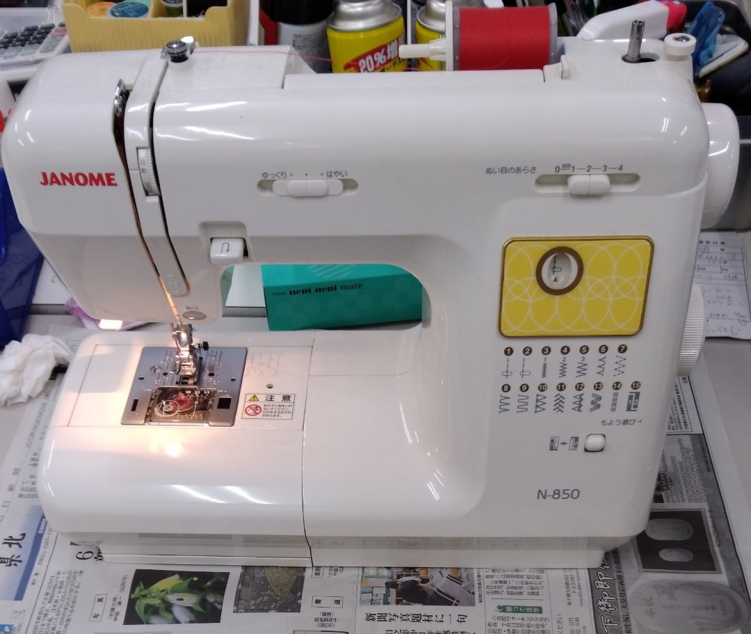 本日は、修理依頼です。ミシンは、綾町にお住まいのお客様で、ジャノメさんの『N850』という実用型自動ミシンです。(下の写真)