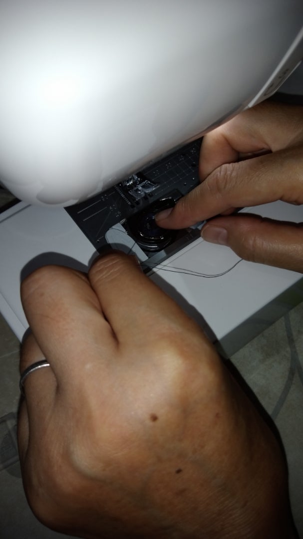 次に、巻き上がった下糸のセットの仕方をお教えします。(下の写真)