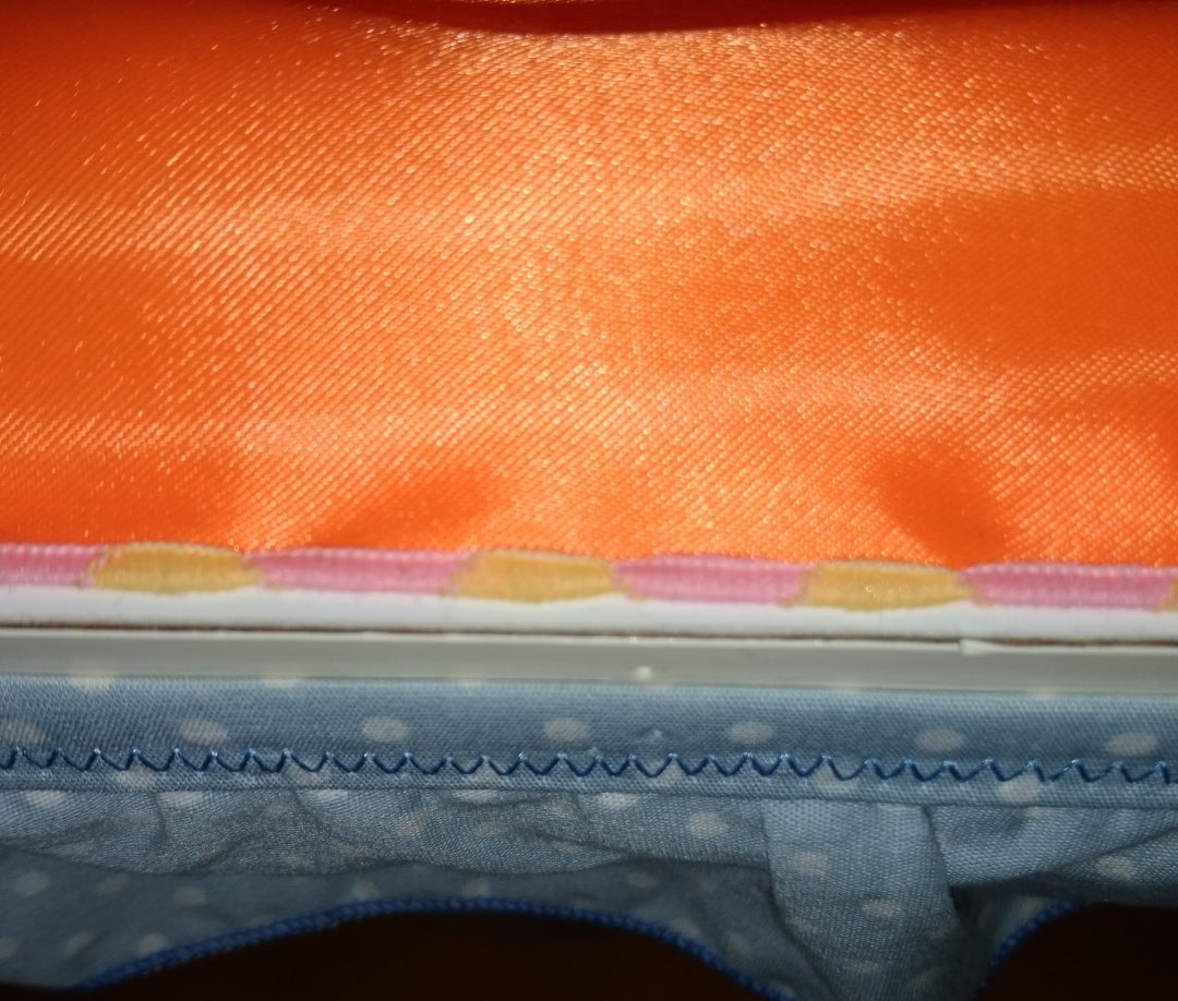 の糸を色付きのスパン糸にする事で、交互に波のようにかがられます。
