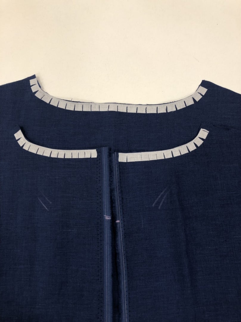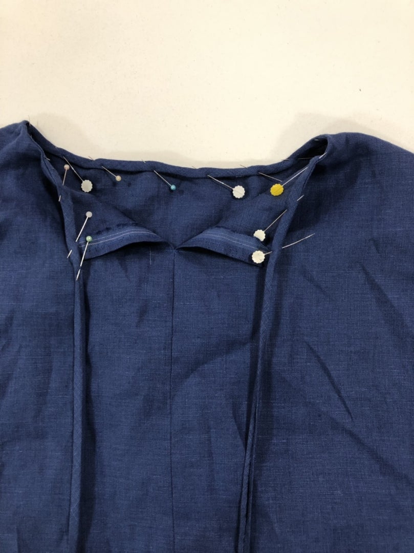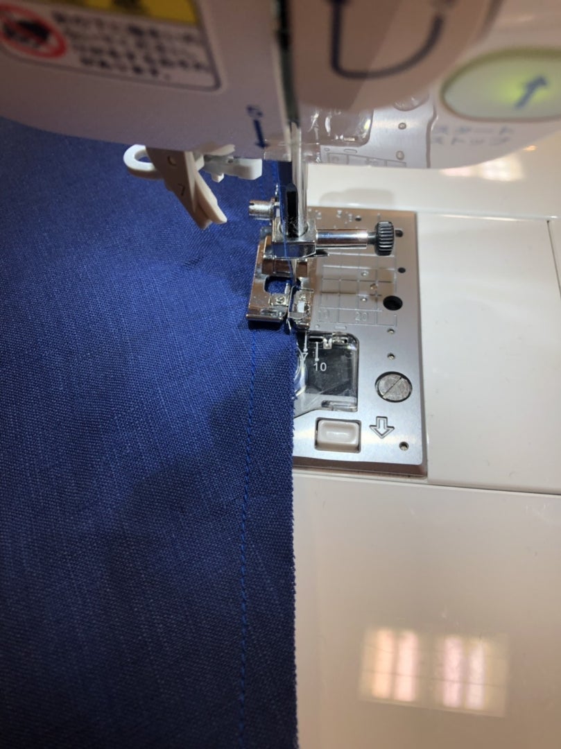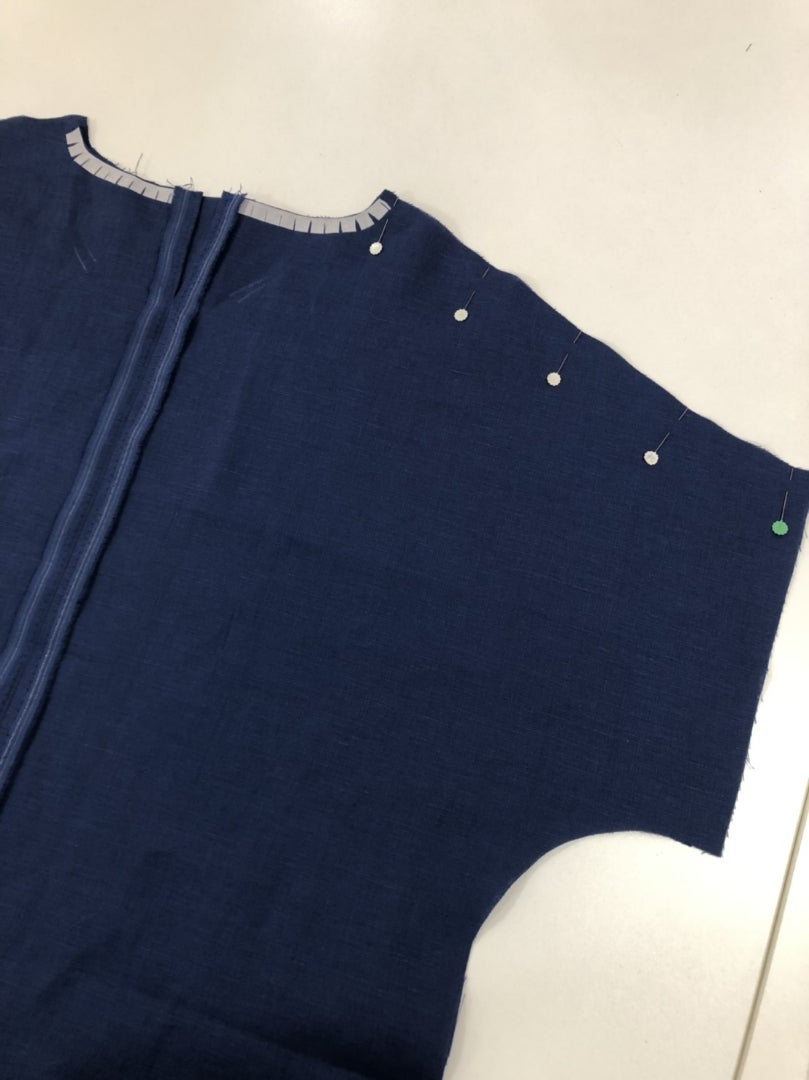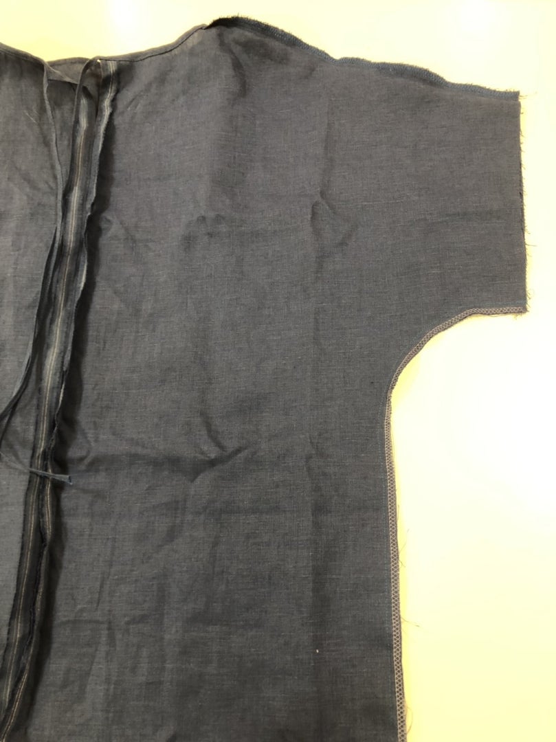 こちらは、前後身頃を中表に合わせて端かがりをした袖下を、縫い合わせるところです。(下の写真)