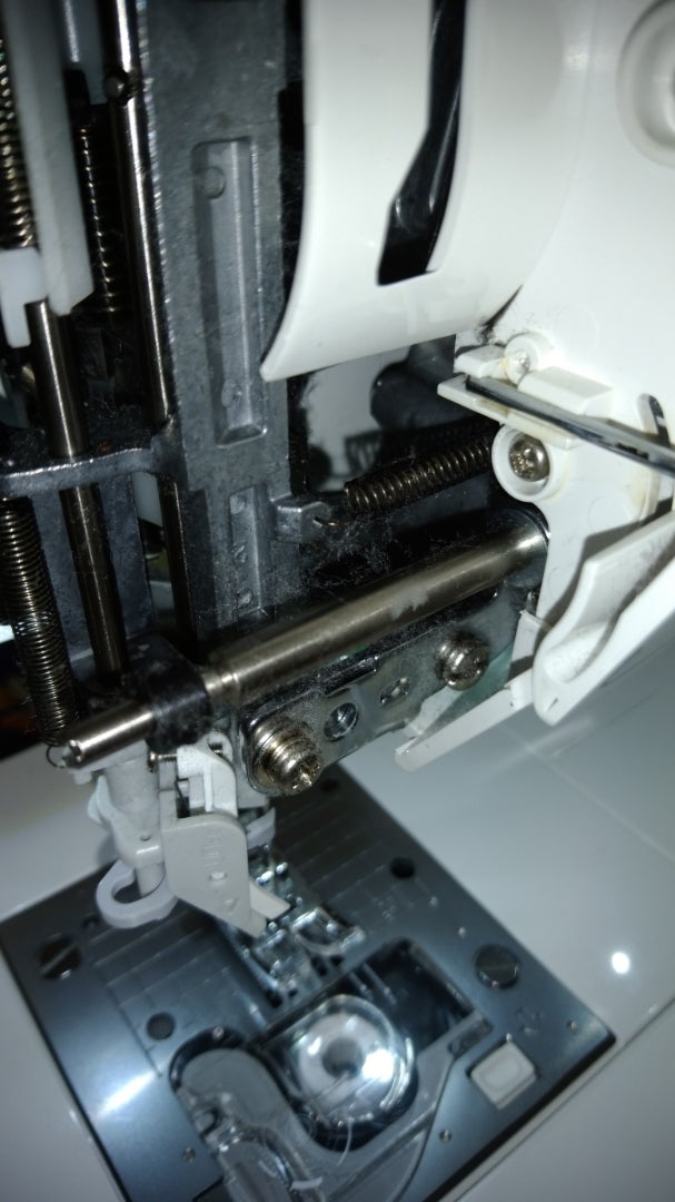 針棒,天秤周辺部分も確認します。やはり、うっすらと縫いボコリがあります。